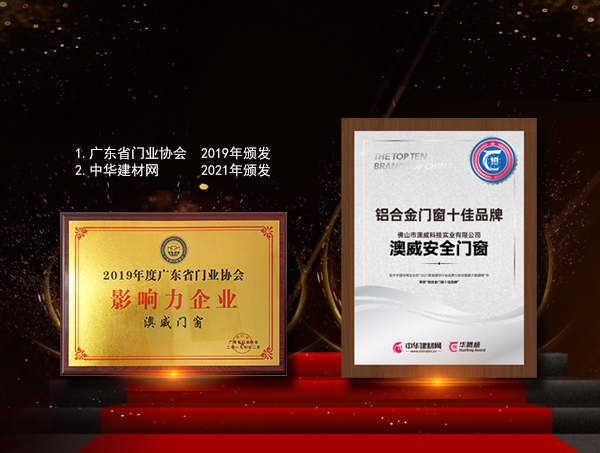 ① 中國商品質(zhì)量名優(yōu)品牌推廣中心 2010年頒發(fā)《商品與質(zhì)量》消費(fèi)市場調(diào)查中心 2010年頒發(fā) ② 廣東省門業(yè)協(xié)會(huì) 2017年頒發(fā)